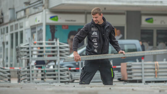 Bald winkt im Herzen Pforzheims wieder ein eisiges Vergnügen: „City on Ice“ nimmt vor dem Pforzheimer Rathaus Form an. Ein siebenköpfiges Team um Geschäftsführer Ron Muckenhuber von Equipmenta Veranstaltungstechnik ist routiniert dabei, den Unterbau für die Eisbahn und das Zelt für Goldis Stadl sowie die Technik für Beschallung und Beleuchtung des über achtwöchigen Spektakels aufzubauen.