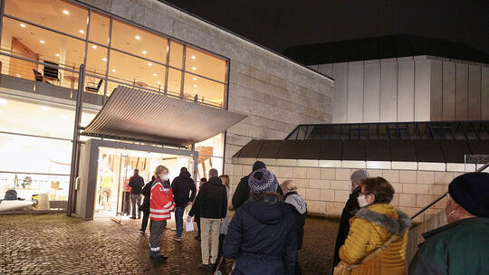 Auch Martin Eberle ist mit seinem Schwiegervater aus Karlsruhe angereist, weil seine Frau in Pforzheim am schnellsten einen Termin finden konnte. Die pensionierte Krankenschwester Birgit Kamuf mit Erstwohnsitz auf Rügen und Zweitwohnsitz in Pforzheim hat sogar Plätzchen als Dankeschön für die Impfenden mitgebracht.