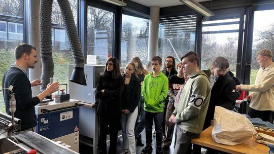 Im Labor durften sie mit einem speziellen Gerät die Materialien ihres Schmucks analysieren – eine praxisnahe Methode, um die Bedeutung der korrekten Materialtrennung für Recyclingprozesse zu verstehen. Auch das Spritzgießverfahren für Kunststoffe wurde vorgestellt, das aufgrund seiner Effizienz kaum Abfälle produziert. Im Zentrum für Präzisionstechnik der Hochschule konnten die Teilnehmenden ein selektives Trennungsverfahren live miterleben. Dabei wurden Materialien einer alten Platine getrennt. Zudem erhielten sie Einblicke in innovative Technologien, die Ressourcen schonen und nachhaltige Produktentwicklungen vorantreiben.