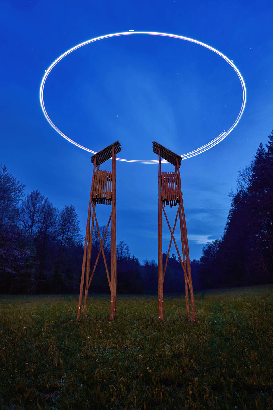 Kreist da ein Ufo, oder hat der Baum einen Heiligenschein? Über einem Rapsfeld bei Bauschlott gelingt mit einem Mix aus präparierter Drohne und Langzeitbelichtung diese Luftmalerei. moritz