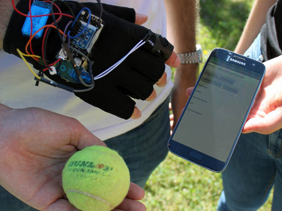 Leonie Gottschalk, Julian Eisenbraun und Jan Deurer konzipierten einen Wurf-Sportassistenten in Gestalt eines Handschuhs: „Unser Prototyp kann anhand von Sensordaten zu Erdbeschleunigung, Abwurfhöhe, Abwurfwinkel und Abwurfgeschwindigkeit die Wurfdistanz berechnen und diese auf einer Handy-App anzeigen lassen“, erklären die Studierenden. „Athleten können so ihr Training alleine durchführen, da die Distanz nicht abgelesen werden muss.“