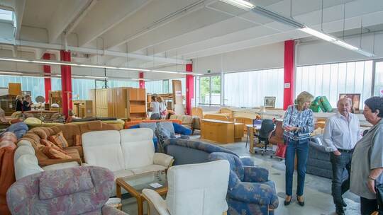 Erste Rundgänge durch das 800 Quadratmeter große Kaufhaus führen den Gästen dessen vielfältige Funktionen vor Augen. Gebrauchtes aller Art – Möbel, Kleidung, Haushaltswaren, Spielsachen, Dekoartikel – kann hier abgegeben werden und wird weiterverkauft, was einen wesentlichen Beitrag zu Müllvermeidung und Nachhaltigkeit leiste, wie mehrere Redner herausstellen. Nicht nur, aber vor allem auch an Menschen, die wenig Geld zur Verfügung haben und sich so dennoch etwas leisten können, richtet sich das Angebot. Zuallererst aber würden hier „gesamtgesellschaftliche Werte“ geschaffen, so Geschäftsführer Bogner. Menschen mit und ohne körperliche oder geistige Einschränkungen könnten ihre Fähigkeiten einbringen und erhielten dafür Bestätigung.