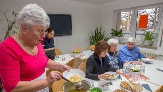 Sie löffeln Grießklößchensuppe, garniert mit Schnittlauch, geschöpft von Ria Flatt, eine der Quartiersrätinnen. „Ein Sonntagsessen damals“, erinnert sich Elisabeth Giek, die das Glück hatte, fünf Monate vor dem verheerenden Bombardement vom 23. Februar 1945 im Rahmen der Kinderlandverschickung in Schonach im Schwarzwald zu sein, während ihre Heimatstadt in Schutt und Asche versank. Rund 18.000 Menschen verloren ihr Leben – davon Gieks Mutter und zwei Brüder. Erst zwei Jahre später schlug sie mit ihrem Vater wieder Wurzeln in der Stadt, die immer noch einer Trümmerwüste glich. Nicht von ungefähr heißt an diesem Montag das Stadtteilzentrum „Trümmer-Café“. Es wird gegessen wie zu Kriegszeiten. Mehr über das „Trümmer-Café“ lesen Sie am Dienstag. in der „Pforzheimer Zeitung“ oder im E-Paper auf PZ-news.