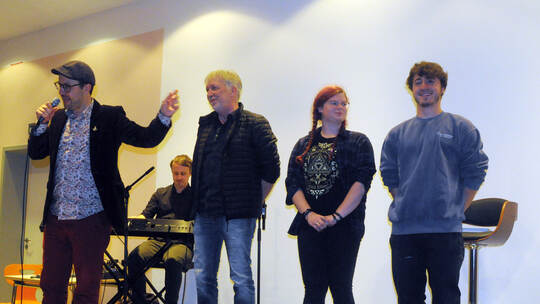 Nach einer kurzen Anmoderation von Ruth Jaeckle (Stadtbibliothek) übernahmen die Zwillingsbrüder Andi und Lino Wirag die musikalische und verbale Führung durch den Poeten-Wettbewerb. Rasch wurden, an verschiedenen Stellen im Saal, sechs sogenannte „Juroren-Inseln“ aus mehr oder weniger zufällig nebeneinandersitzenden Gästen gebildet. Kurz darauf stellte Lino Wirag acht Slam-Kandidaten aus Karlsruhe, Malsch, Mannheim, Pforzheim und Stuttgart vor.