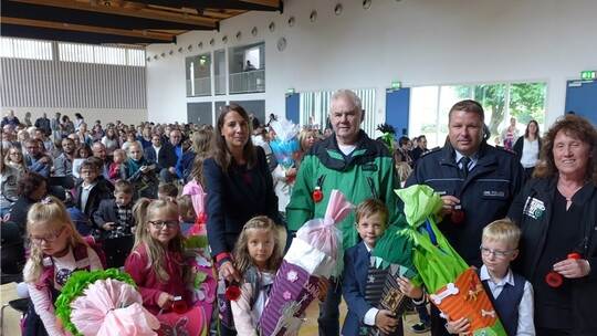 Insgesamt 3000 Reflektoren für Kleidung und Schulranzen verteilten sie an die Erstklässler in Pforzheim und dem Enzkreis. Gemeinsam mit ihrem Kollegen Peter Ludwig und der Unterstützung von Polizist Thomas Neumann von der Verkehrsprävention verteilte Daniela Vogel, erste Vorsitzende der Verkehrswacht, die Reflektoren an die Huchenfelder Erstklässler. „Unser oberstes Ziel ist es, dass alle Schulkinder gesund zur Schule und zurück kommen. Dazu müssen die Schüler sichtbar und die Straßen sicher gemacht werden“, sagte Vogel bei der Einschulungsfeier in der Hochfeldhalle. Thomas Neumann gab den besorgten Eltern hilfreiche Tipps mit auf den Weg. Zunächst sei die Erkennbarkeit der Kinder sehr wichtig. Helle Kleidung sowie Reflektoren sorgen dafür, dass Autofahrer die Erstklässler auch im dunkeln frühzeitig erkennen. Es sei außerdem ratsam, den Schulweg gemeinsam mit den Kindern zu üben. Dabei sollte bedacht werden, dass Kinder im Gegensatz zu Erwachsenen nicht auf einen Erfahrungsschatz zurückgreifen können und daher oft anders entscheiden als ihre Eltern. Aufgrund ihrer Größe sind sie außerdem nicht in der Lage, über ein geparktes Auto hinweg zu blicken. Neumann rät den Eltern, sich selbst auf die Perspektive der Kinder zu begeben, um ihre Sicht der Dinge besser zu verstehen. Dabei sollten die Kinder selbst eigenverantwortliche Entscheidungen treffen dürfen, und diese ihren Eltern erklären. Nur so könnten die Kinder später auch alleine richtig reagieren.