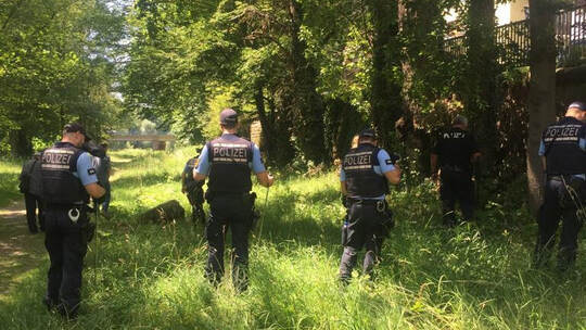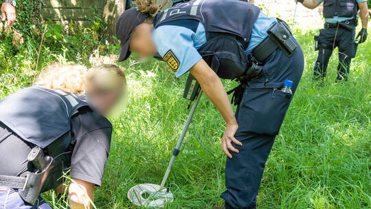 Die Polizisten laufen langsam durchs Gras am Enzufer, stochern mit Stangen im Grün oder gehen mit tragbaren Metalldetektoren voran. Immer wenn ein Gegenstand in den Bereich der Detektoren kommt, piepsen diese los, wie man es von den großen Geräten am Flughafen kennt.