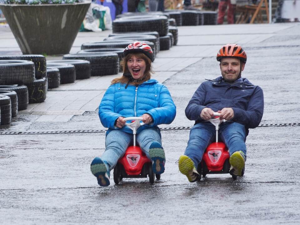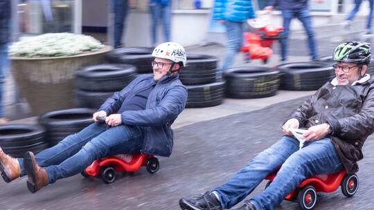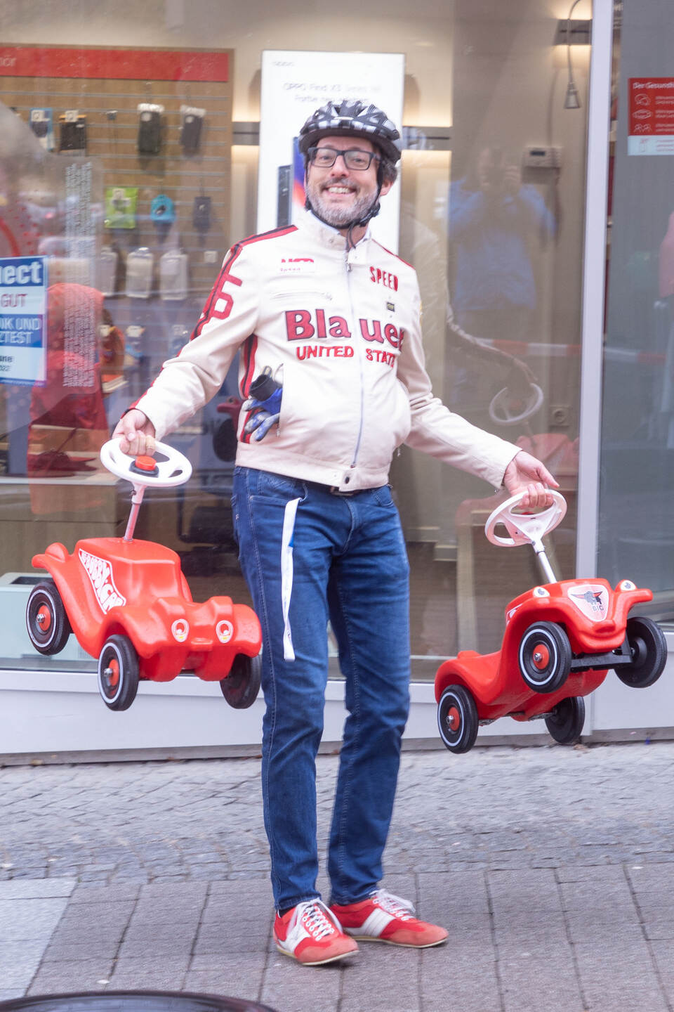 Renner findet die Aktion „cool“ und sagt, für den guten Zweck sei er gerne dabei. Als ehemaliger Rektor weiß er: „Schulsozialarbeit ist etwas sehr Wertvolles.“ Auch der CDU-Bundestagsabgeordnete Gunther Krichbaum und seine Frau Oana haben sich am Sonntagnachmittag gerne aufs Bobby-Car gewagt – und zwar ziemlich erfolgreich.