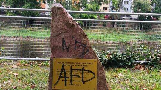 Pforzheim. Von der PZ darauf angesprochen, hat die Polizei sofort den Staatsschutz eingeschaltet: Unbekannte haben den Friedensstein der Ahmadiyya-Gemeinde an der Emma-Jaeger-Straße beschmiert und geschändet. Nach Angaben des Polizeisprechers Frank Otruba besteht hier für die Behörden eine Pflicht zur Strafverfolgung.