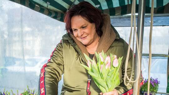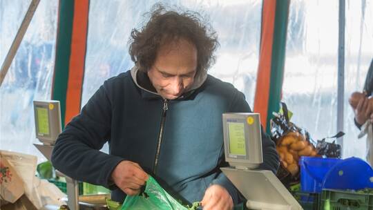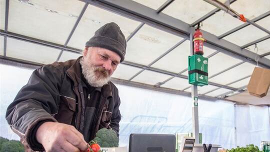 „Zwiebel“, dieses Wort hört man immer wieder. Und damit ist nicht das schmackhafte Lauchgewächs gemeint. Man trägt Lagen – Claudia Remp am Stand der Gärtnerei Hüttler etwa eine Angora-Unterhose unter der Jeans und drei Pullis unter der Thermojacke. Im vorgewärmten Lastwagen hat sie vom Enzauenpark Blumen zum Turnplatz gefahren und im durch ein Gas-Gebläse erwärmten Zelt angerichtet. Für Blühendes seien diese Temperaturen grenzwertig, sagt Remp. Aber gerade so geht‘s, und die bunte Pracht zaubert einen Hauch von Frühling in die Eiseskälte. Mit Plastikplanen eingehaust ist auch der Stand von Hans Sichelmann aus Pforzheim, hinter dem Verkäufer Jakob Lutz sich selbst und die Ware mit einem Gasbrenner wärmt. Kohl etwa sei robust, aber Tomaten, Auberginen oder Paprika legten „gleich die Ohren um“, wenn es frostig werde. Und die Kartoffeln würden dann süß. Lutz selbst setzt auf dicke Klamotten und Haarwuchs. „Ich trage meinen Winterbart“, sagt er verschmitzt.