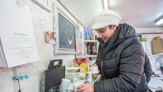 Die Füße müssen warm sein, weiß Pforzheims „La Signora“ Cornelia Bullegas, die auf selbstgestrickte Socken schwört. An ihrem Stand für italienische Spezialitäten hat sie den kleinen Grill umfunktioniert. Kaffeetässchen stehen darauf, bis sie gebraucht und befüllt werden – „sonst wäre der Espresso in Sekundenschnelle kalt“.