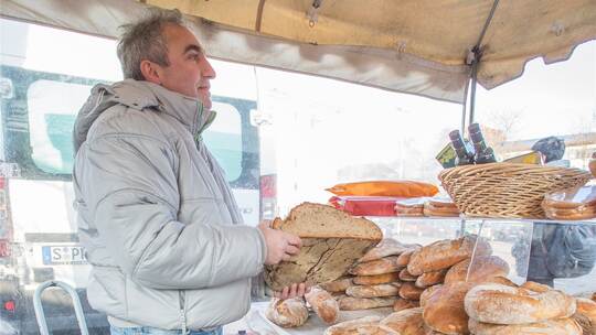 Nur müde lächeln kann indes Domenico Volcano über die aktuellen Temperaturen. Der italienische Bäcker aus Stuttgart hat jahrelang als Dachdecker gearbeitet – in großer Höhe bei eisigem Wind. Nun kann er am Boden bleiben, den Elektro-Ofen zu Füßen.