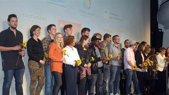Gut zwei Dutzend Menschen aus aller Welt würdigten Christine Müh (KoKi) und Projektleiterin Mirzeta Haug bei der Schlussveranstaltung auf der Bühne im Kulturhaus Osterfeld. Alle hatten an dem Projekt Anteil: vor oder hinter der Kamera, in der Logistik oder in der Außendarstellung. Auch das Engagement von Menschen, die sich auf unterschiedlichste Art und Weise für das Wohl und die Integration von Flüchtlingen einsetzen, wurde in den Filmen und am Abschlussabend ausdrücklich gewürdigt. Zuvor hatte ein von Regisseur und Kameramann Alexander Bambach eigens zusammengestelltes und neu geschnittenes „filmisches Potpourri“ alle 16 Porträtierten (die PZ berichtete) nochmals in Erinnerung gerufen.
