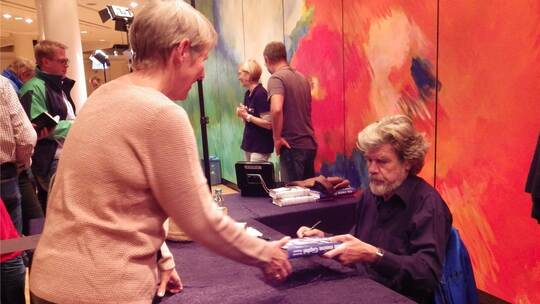 Von Heimat bis Tod – Messner gab sehr persönliche Einblicke in seine Kindheit, Jugend und auch die späteren Jahre als Extrembergsteiger. Der in Südtirol aufgewachsene Messner beschrieb den Alpinismus in drei Phasen. „Zu Beginn der Eroberung der Bergwelt spielten die Gipfel die größte Rolle. Dann wurde der (schwierigste) Weg zum Ziel, und später versuchte man mit so wenigen Hilfsmitteln wie möglich auszukommen“, so Messner, der das Bergsteigen als kulturelle Erscheinung anhand vieler spannender Erlebnisse und Anekdoten näher beleuchtete. Auch die Frage, was ihn und seine „Artgenossen“ antreibt, versuchte er dem Publikum zu beantworten. „Natürlich hatte ich dabei Angst, wer keine Angst hat, ist dumm“, erklärte er. „Dennoch ist die Überwindung der Angst durch die eigenen Kräfte wie eine Art Wiedergeburt“. Heute, mit 75 Jahren, habe sich sein Blick verändert, auch bedingt durch die schwindenden körperlichen Kräfte. „Mein Blick richtet sich heute mehr auf die Menschen als auf die Gipfel“, betonte er.