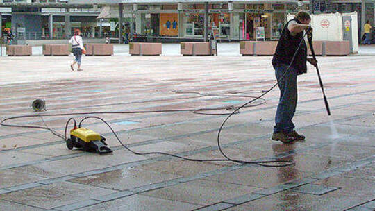 Auch das OechsleFest hat seine Spuren hinterlassen. Plastikplanen unter den Küchenbereichen sollten den neuen Plattenbelag vor Fett und anderem schützen, Doch dort, wo sich die Leute aufgehalten haben, zeigen sich nach dem Abbau der Lauben mehr oder weniger größere Flecken von Essensresten oder ausgeschüttetem Wein. Für die Wirte stand schon zuvor fest, dass sie den Platz nach dem Fest gründlich reinigen lassen werden. Zusammen mit einem Vertreter der Technischen Dienste gab es bereits einen Vor-Ort-Termin und Festwirt Dietmar Weiß ließ seinen Bereich schon mal vorab vom gröbsten Schmutz reinigen.