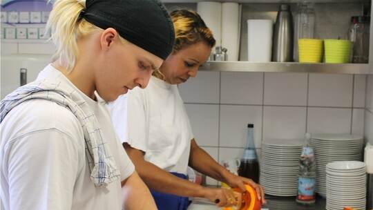 Oxana D. (Name geändert), alleinerziehende Mutter, ist so ein Fall. Sie würde gerne Köchin werden, aber ihre Kinder sind noch zu klein, die Betreuungsmöglichkeiten zu schlecht, um einen Beruf wie den des Kochs, der außergewöhnliche Arbeitszeiten mit sich bringt, mal eben so erlernen zu können. Deshalb hat sie sich entschieden, erst einmal das Bausteinprogramm im „Anker“ zu durchlaufen. Das gibt ihr die Möglichkeit, sich zu qualifizieren, Einblicke zu erhalten und vor allem, nur zwischen 10 und 15 Uhr zu arbeiten. „Es macht mir Spaß, alle Gerichte zu kennen, mit den Waren umzugehen und ich habe eine Aufgabe – damit fühle ich mich gut“, erzählt die 30-Jährige und lächelt ein wenig verschüchtert.
