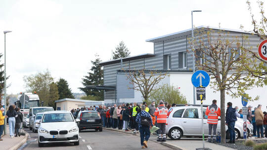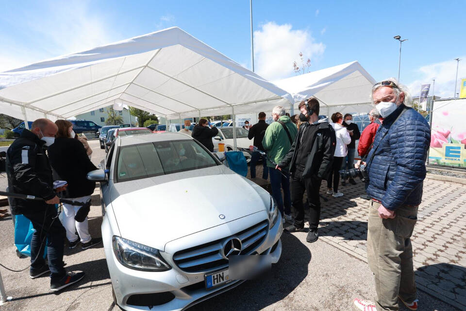 Zahlreiche Autos haben sich in die Schlange vor dem Parkplatz eingereiht. Auch das Interesse der Medien an der Aktion ist überwältigend.