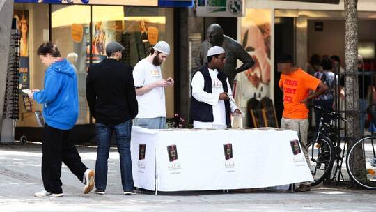 {element}Und reden will der Passant mit den extremistischen Salafisten auch nicht. „Mir reicht schon, wie die mit anderen argumentieren“, sagt er kopfschüttelnd und geht weiter. Mit Käppi und Kaftan stehen die Salafisten an ihrem Stand, begleitet von einer Frau mit Kopftuch und einem Kleinkind. Wenn es darum geht, übers Paradies und den wahren Glauben zu reden, sprudelt es aus den extremistischen Islamisten heraus, lautstark, hitzig. Vor allem die Frau scheint ihren Fanatismus durch eine besondere Lautstärke Ausdruck verleihen zu wollen.