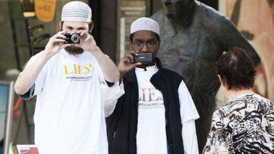 {element}Während sie filmen, werden sie fotografiert. Fürs Poesiealbum dürften die Fotos der Salafisten nicht gedacht sein. Mit dem Bilderverbot im Koran nehmen sie es genau, aber Fotos von kritischen Mitbürgern zu machen scheint kein Tabu zu sein.