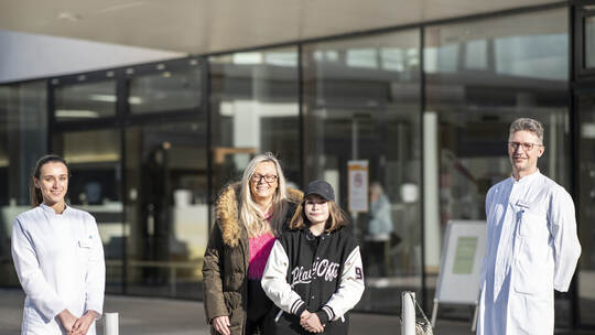 Zwei Jahre nach dem Reitunfall empfängt Dr. Jonas Apitzsch, Chefarzt der Radiologie (von rechts), seine Patientin Laura Pintauer und ihre Mutter Suzana Pintauer gemeinsam mit seiner Assistenzärztin, Nour Maalouf, im Helios Klinikum Pforzheim