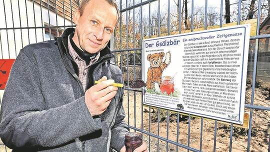 Deutlich größer, aber ebenfalls scheu ist der zweite Hoffnungsträger: der „Ursus marmelatta pforzheimi“, im Volksmund Gsälzbär genannt. Das Tier sei ein Pforzheimer Urgewächs und zugleich ein Glücksfall, sagt Schwarz. Seines Wissens konnte sich bislang kein anderer Zoo ein solches Exemplar sichern. Wie er an den Gsälzbären kam? Kein Kommentar. Nur so viel: Sein Anbieter wolle anonym bleiben. In freier Wildbahn sei diese Bärenart, die süße Nahrung bevorzuge, nicht mehr anzutreffen. Um so mehr erfülle es ihn mit Stolz, den Gsälzbären präsentieren und erhalten zu dürfen. Schwarz freut sich, dass der Bär gleich neben seinem Büro im Verwaltungsgebäude eine Bleibe gefunden hat. „Ab und zu sehe ich ihn durchwitschen, er ist sehr misstrauisch.“ Und offenbar auch wählerisch. Das Wildpark-Team müsse etwa penibel darauf achten, dass die als Lockmittel verwendete Marmelade die perfekte Temperatur habe.