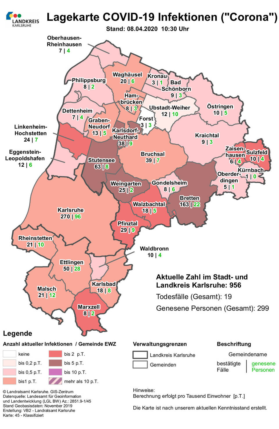 956 Infizierte und 19 Todesfälle vermeldet der Stadt- und Landkreis Karlsruhe am Mittwoch. An der Grenze zum Enzkreis fällt Bretten mit seinen 163 Infizierten total aus dem Rahmen. Die anderen Grenzbereich-Gemeinden haben deutlich weniger: Pfinztal (29 Fälle), Karlsbad und Walzbachtal (je 18), Waldbronn 10), Marxzell (8), Oberderdingen (5) und Kürnbach (1). Ebenfalls viele Corona-Fälle im Landkreis Karlsruhe weisen Stutensee (63) und Ettlingen (50) auf. In der Stadt Karlsruhe werden 270 Corona-Infizierte gezählt.