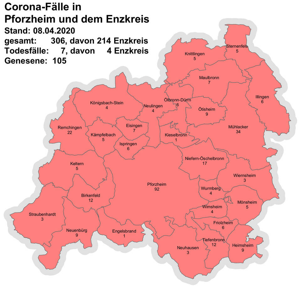 Damit steigt die Zahl der Todesfälle in Pforzheim und dem Enzkreis auf insgesamt sieben – drei aus dem Stadt- und vier aus dem Kreisgebiet.Insgesamt wurden in Pforzheim (92 Fälle) und im Enzkreis (214 Fälle) am Mittwoch 306 Corona-Infizierte gezählt, das sind acht mehr als am Dienstag, wobei es im Enzkreis fünf neue Corona-Fälle gab und in Pforzheim drei. 105 Personen gelten als genesen. Im Enzkreis hat Mühlacker mit 34 Infizierten die meisten Corona-Fälle vorzuweisen, gefolgt von Remchingen (22 Fälle), Niefern-Öschelbronn (17) sowie Tiefenbronn und Birkenfeld mit je 17 Fällen. Die Enzkreis-Gemeinden mit den wenigsten Fällen sind Kieselbronn und Engelsbrand mit je einer infizierten Person.