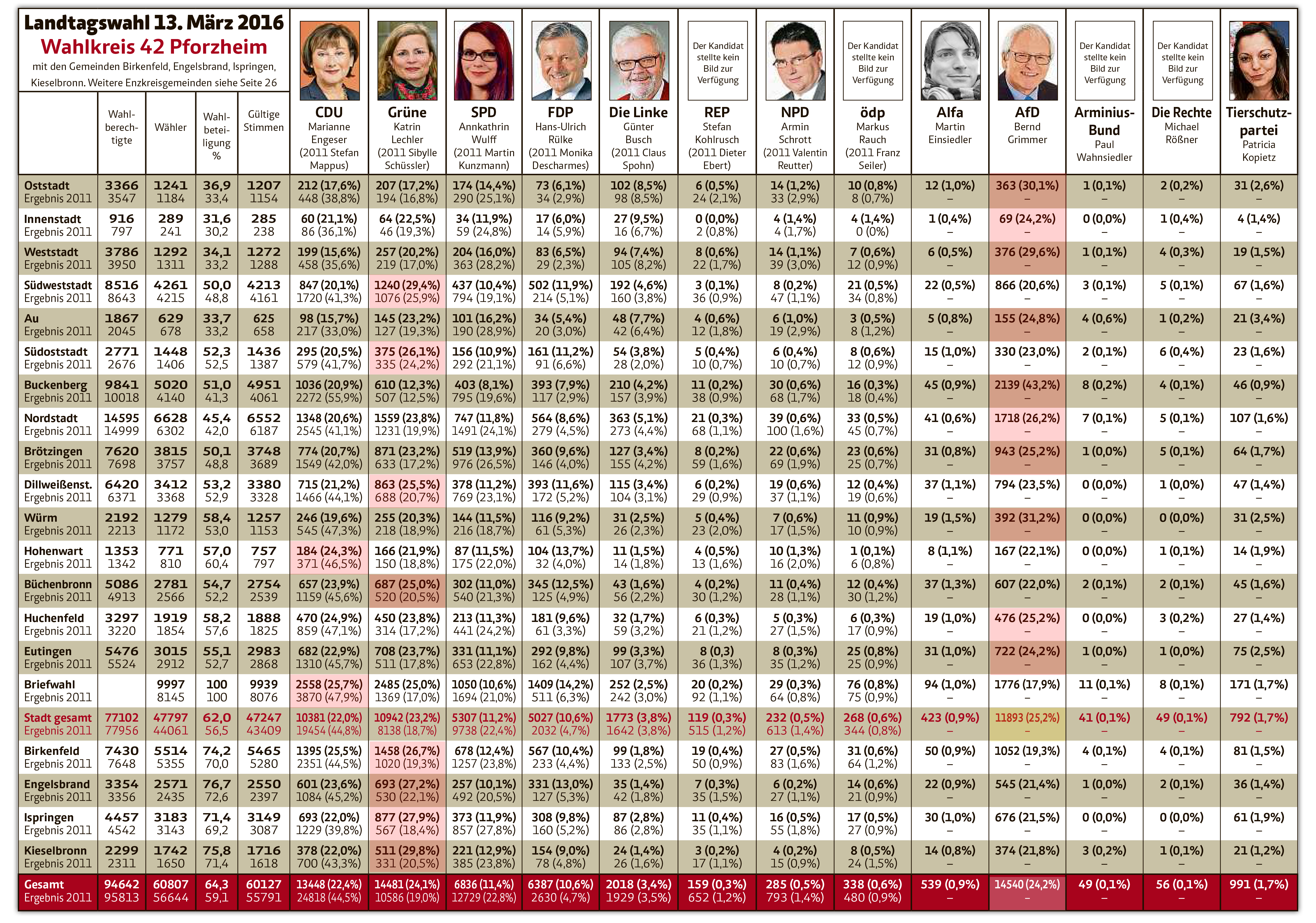 In insgesamt zehn von 20 Wahlbezirken des Wahlkreises Pforzheim, wozu auch Engelsbrand, Birkenfeld und Ispringen zählen, hat die AfD die relative Mehrheit errungen. Die restlichen Wahlbezirke gehen weitgehend an die Grünen, lediglich die Briefwähler und Hohenwart stimmten für die CDU. Hohenwart war bei der letzten Wahl im Jahr 2011 noch absolute CDU-Hochburg (46,5 %). Nun konnten die Schwarzen auch dort nur 24,3 Prozent holen, dicht gefolgt von der AfD, die mit nur 17 Stimmen direkt dahinter liegt.