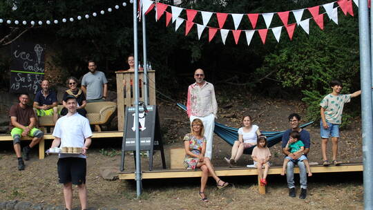 Nach vorherigen Ideen wie der Plakataktion „PFenedig“ gibt es auch jetzt, im Rahmen der Aktion „Summer in the City“, ein Projekt zur Neuentdeckung des Quartiers rings um die Bleichstraße. Das „grüne Juwel“, das ihn an den Central Park erinnere, so Kröner (Mitte, stehend), solle als„Beobachtungspunkt“ im Stadtviertel dienen. Die Idee für den Eisverkauf kam, als sich herausstellte, dass Kröners Lieblingseisverkäufer seine Produktion direkt gegenüber hat. Somit war klar: Raphael Assfalg (vorne links) von der Eismanufaktur „C.R.E.A.M“. wird, immer am Wochenende von 13 bis 19 Uhr, hier sein Eis verkaufen. Bei Bedarf könne man die Verkaufszeiten aber auch erweitern, so Assfalg. Die „Rückzugsinsel“ mit Hängematte und Sofa steht noch bis zum 14. Oktober in der Oberen Rodstraße.