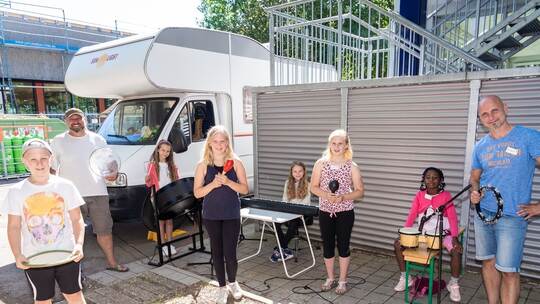 „Es ist notwendig, dass wir raus zu den Kindern gehen“, weiß er. Und so gibt es verschiedene Stationen im Schulhof, die bespielt werden können. Auch Liedermacher Roland Bliesener ist mit seinem Wohnmobil hier, um Musik mit den Mädchen und Jungen zu machen. Er hat Steel-Drums genauso mitgebracht wie Percussions und Bongos. „Viele exotische Instrumente, die einen besonderen Sound liefern.“ Denn die Stationen sind vernetzt: Wenn das Filmteam, das im Glaskasten der Schule positioniert ist, ruft, dann sind die Musiker da. So entstand bereits ein guter Beat, der als Grundlage eines Tanzvideos dient. Die Kinder seien von diesem übergreifenden Arbeiten begeistert.