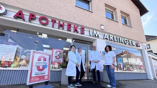 Auch die Arlinger Apotheke bleibt am Montag, 23. März, geschlossen: Elke Gloistein, Sarah Ochner, Inhaber Christian Kraus und Manuele Bischoff (von links) bedienen an diesem Tag keine Patienten.
