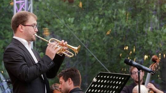 Bei drei Trompetenkonzerten von Telemann, Händel und Haydn wirkt der junge, sympathische Solotrompeter des Leipziger Gewandhauses, Jonathan Müller, mit. Ein Musiker der lauten Töne scheint er nicht zu sein, wenn er auch „Bourée“ und „Marsch“ der Händel-Suite D-Dur mit feierlichem Glanz versieht. Das Malerische, die feinen Verzierungen sind eher seine Sache, so etwa beim Adagio von Telemanns D-Dur-Konzert. Mit Handschuh am Cembalo bringt er die Melodie zum Leuchten. Für ein Open-Air-Konzert mit Nebengeräuschen wirkt sein Spiel aber ein wenig zu dünn, so auch bei Haydns Es-Dur-Konzert mit Pauken und Bläsersatz. Eine kurze Unsicherheit zeigt sich im kantablen, zweiten Satz, der dritte gelingt mit Schmiss und Leichtigkeit. Kulturbürgermeisterin Sibylle Schüssler hatte recht: Das war „ein weiterer Glanzpunkt“.
