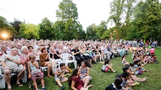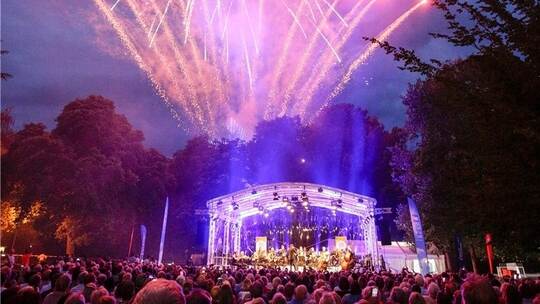Pforzheim. Ein Open-Air-Knaller mit allem Drum und Dran ist das Feuerwerkskonzert des Südwestdeutschen Kammerorchesters Pforzheim im Rahmen der „Goldenen Momente“ im Stadtgarten – mit einem unvergesslichen Finale für alle Sinne. Mehr als 1000 Gäste lauschen auf Decken, Garten- und Campingstühlen, erleben Bühne und Bäume in stimmungsvollem Licht. Es herrscht eine lockere Atmosphäre, bei der just zwischen den Sätzen applaudiert wird.
