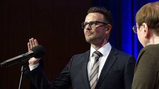 Stadträtin Ellen Eberle nimmt Peter Boch den Amtseid ab. Die Amtseinführung des neuen Pforzheimer Oberbürgermeisters ist eingebunden in eine öffentliche Gemeinderatssitzung. Erwartet wurden über 1000 Zuschauer im CongressCentrum Pforzheim.