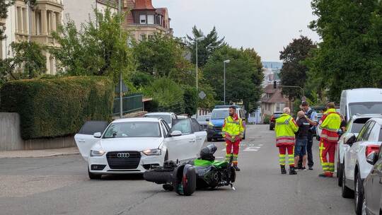Pforzheim. Der erste Anblick lässt an diesem Donnerstagvormittag Schlimmes vermuten. Ein Motorrad liegt nahe der Einmündung der Bunsenstraße auf der Schwarzwaldstraße. Davor steht ein Auto mit offenen Türen. Drumherum sind Polizisten und Ersthelfer im Einsatz, Rettungswagen stehen bereit.