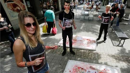 Drastischer Anblick: Mit Kunstblut beschmierte Aktivisten der Tierschutzpartei liegen in menschengroßen Fleischschalen in der Fußgängerzone. Tilo Keller