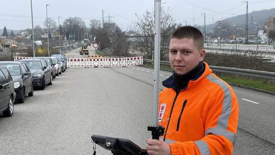 Zum Auftakt der Maßnahmen werden zum einen Vermessungsarbeiten für den neuen Kreisverkehr auf Höhe