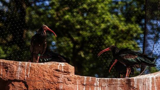 Pforzheim. Am liebsten sitzen die elf Waldrappe – eine in Europa seltene Ibisart – ganz oben auf dem sonnenbeschienenen Sandsteinfelsen und breiten genussvoll die Flügel aus. In der zweigeteilten neuen Großvoliere im Wildpark haben die schwarzen Vögel mit ihren markanten roten Schnäbeln nun eine Fläche von 270 Quadratmetern zur Verfügung, in deren Mittelpunkt steht ein künstlicher Felsen mit Vor- und Rücksprüngen als Sitz- und Nistplatz.