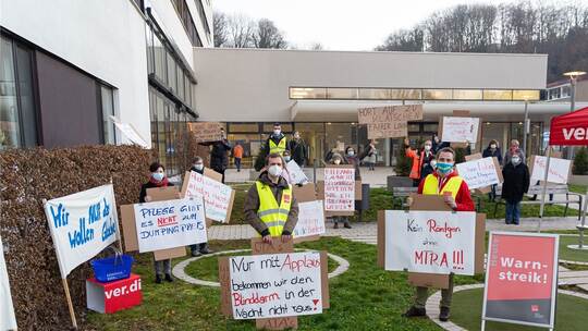 Und da stehen sie, nicht in Massen, wie man das in Nicht-Corona-Zeiten kennt, oder mit Trillerpfeife, sondern am Rand des Parkplatzes des Klinikums mit Plakaten: Beschäftigte der Spätschicht und Gewerkschafter von Ver.di. Sie verteidigen ihre Haltung, auch in Zeiten hoher und höchster Inzidenz-Zahlen für Corona-Sonderzahlungen (wie in anderen Kliniken teilweise erfolgt), eine neue Eingruppierung und neun Prozent mehr Gehalt zu demonstrieren. Natürlich, ohne dass ein Risiko für die Patienten bestehe, sagen sie. Nicht nur im Bereich der Intensivbetten sei die Normalversorgung, sondern in allen anderen Bereichen auch die Notversorgung gewährleistet.