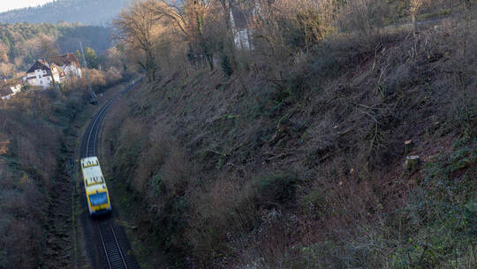Tatsächlich liegt vor Ort eine große Menge Schnittgut und am Hang fehlen die Bäume. Laut Bahn ist das Vorgehen aber nicht unüblich.
