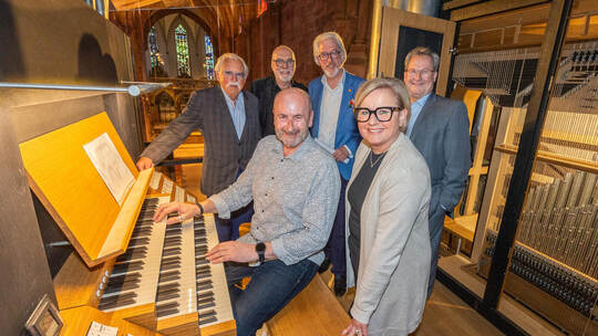 Pforzheim. Es ist wortwörtlich eine Wucht, wenn ein Könner wie Udo Schlittenhardt alle Register zieht und die jüngst umfassend überarbeitete Steinmeyer-Orgel in der Schloßkirche ihren vollen Klang entfalten lässt. Dass sie nun den letzten, entscheidenden Pfiff erhalten kann, sei dem PZ-Verleger Albert Esslinger-Kiefer zu verdanken, betont Georg Leicht, der Vorsitzende des Fördervereins an der Schloßkirche St. Michael, beim Ortstermin hoch droben im Kirchenschiff direkt vor den Tasten dieser Königin der Instrumente.