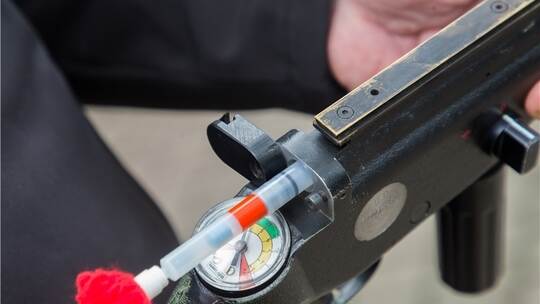 Vom Hochsitz aus einen Keiler auf 150 Meter zu treffen, sei nicht so schwierig. Die Kugel laufe ja mit hoher Geschwindigkeit in einer recht geraden Flugbahn. „Die fliegende Spritze“, so Schwarz über den Narkosepfeil mit dem roten Puschel am hinteren Ende, fliege ungleich langsamer und in einem Bogen. Hinzu kommt: Der Pfeil fliegt durch Luftdruck. Den muss der Schütze am Gewehr exakt einstellen.