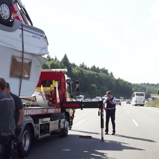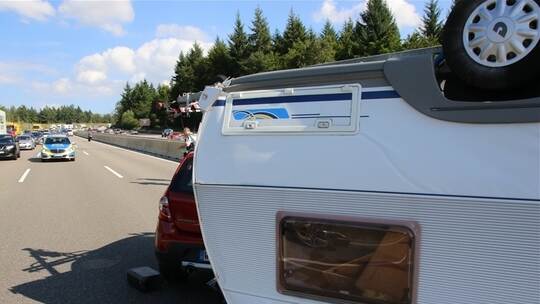 Pforzheim. Zu schnell unterwegs? Oder war es ein Fahrfehler? Am Freitag um 16.15 Uhr schaukelte sich auf der A8 auf einer leichten Gefällstrecke zwischen den Anschlussstellen Pforzheim-West und Karlsbad ein Wohnanhänger auf, der dann in die Mittelleitplanke kippte und auf dem Dach landete. Er brach auf und eine Gasflasche wurde undicht. Das war der Anfang einer stundenlangen Warterei der Autofahrer, die hinter dem Gespann Richtung Karlsruhe fuhren.