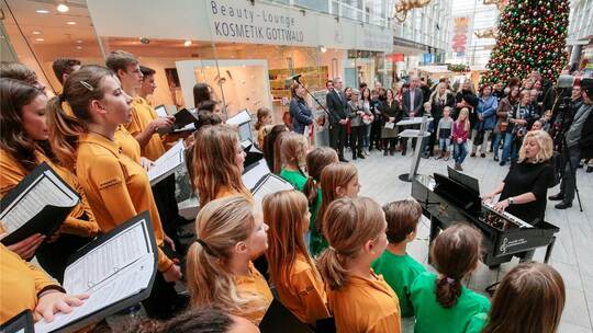 Und dann kehrt plötzlich Ruhe ein. Die Kinder der Chor-Akademie stehen bereit, und Chorleiterin Salome Tendies hat am Klavier Platz genommen. „Santa Lucia“, „Frohe Weihnacht“, „Dreaming“ und „Postamt Wolke 7“ sind die Titel der Stücke, die die Besucher im VolksbankHaus verzaubern. Eindrucksvoll und perfekt.