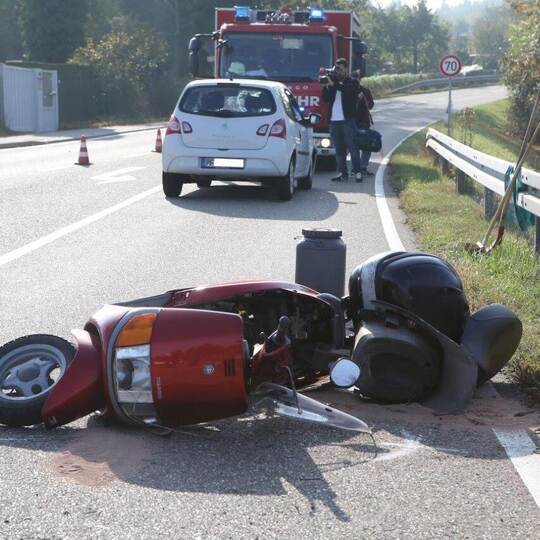 Pforzheim. Am Dienstagvormittag sind ein Roller und ein Auto auf der Eisinger Landstraße zusammengestoßen, der 70-jährige Rollerfahrer zog sich bei dem Unfall schwerste Verletzungen zu.
