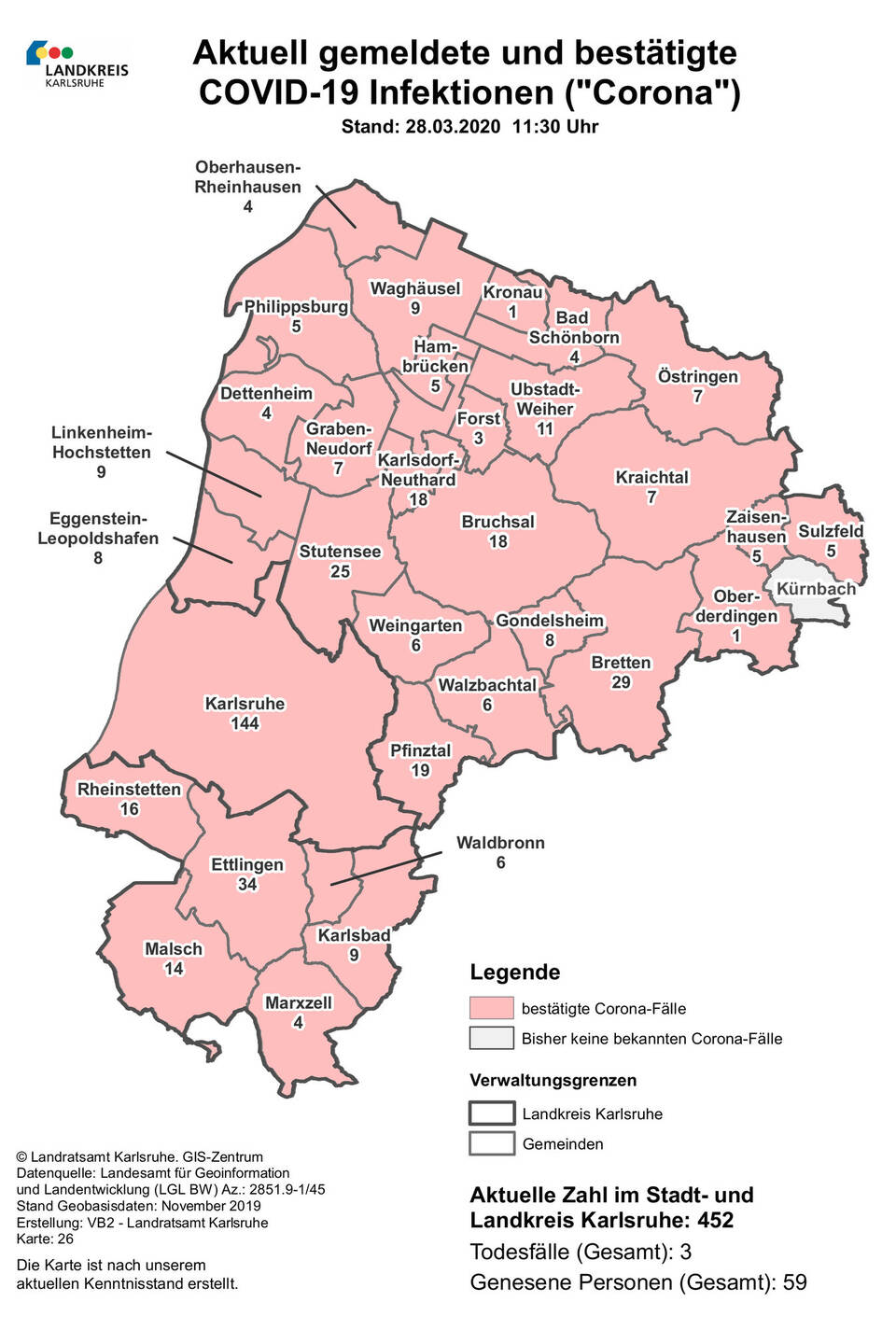 Gegenüber Freitag hat sich die Zahl der neuen bestätigten Corona-Infizierten in Stadt- und Landkreis Karlsruhe von 413 auf 452 erhöht. In Karlsruhe gibt es nun 144 Fälle und in Bretten am Nordrand des Enzkreises sind es nun 29. Die einzige Kommune im Landkreis Karlsruhe ohne einen Corona-Fall ist Kürnbach. An der Kreisgrenze zum Enzkreis sieht es so aus: Marxzell (4 Fälle), Karlsbad (9), Waldbronn (6), Pfinztal (19), Bretten (29), Walzbachtal (6) und Oberderdingen (1).