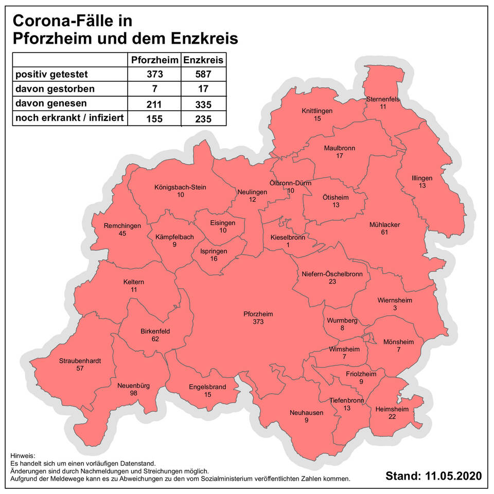 Von den 373 Corona-Infizierten in Pforzheim sind nach Abzug der inzwischen Genesenen nur noch 155 auf der Liste der aktuell Infizierten, was einer Genesenenquote von 56,6 Prozent entspricht. Diese Quote hat sich nun der lange Zeit deutlich höheren Enzkreis-Quote von aktuell 57,1 Prozent angepasst. Landesweit sind die Genesungsquoten jedoch deutlich höher. Im Stadt- und Landkreis Karlsruhe liegt die Quote bei 83,4 Prozent (1159 Genesene, 1390 Infizierte, 85 Todesfälle).
