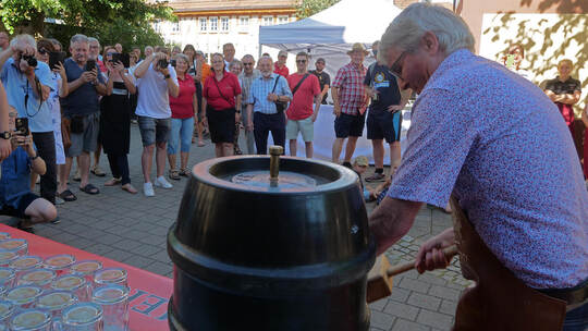 Illingen. Drei, vier kurze Schläge hat Illingens Bürgermeister Armin Pioch gebraucht, dann floss auch schon das Freibier – begleitet vom „Prosit der Gemütlichkeit“, das der Musikverein Illingen intoniert hat. Bei sommerlich heißen Temperaturen war damit das diesjährige Dorf- und Kelterfest offiziell eröffnet. Es ist die inzwischen 49. Ausgabe und damit die letzte vor dem großen Jubiläum im kommenden Jahr. 13 Vereine und drei gewerbliche Händler haben sich am Wochenende beteiligt. Zudem gab es ein Bürgermeister-Gastspiel aus dem benachbarten Wiernsheim: Rathauschef Matthias Enz trat hier auf, allerdings in anderer Funktion.