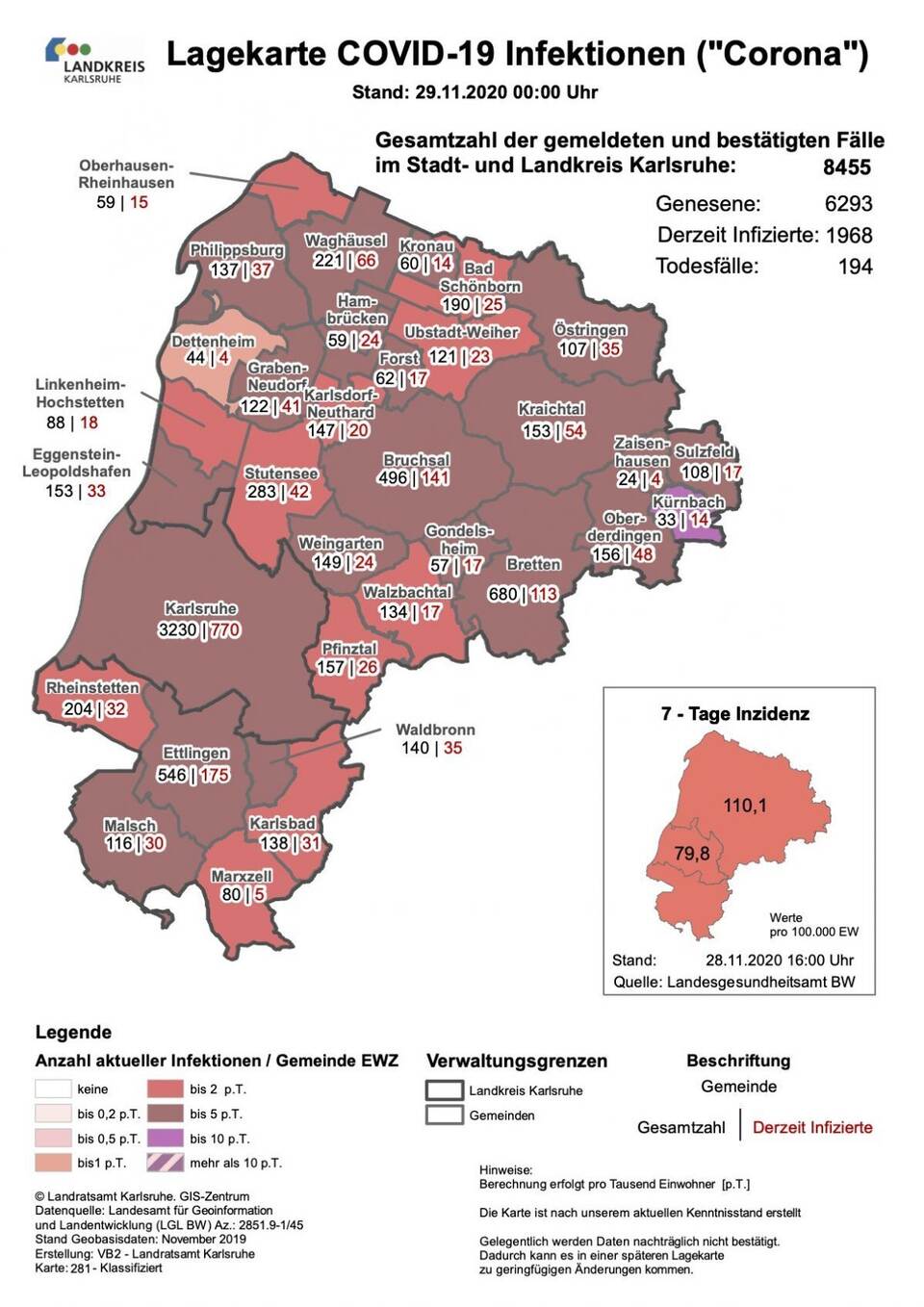 Zwei neue Todesfälle bestätigt das für den Land- uns Stadtkreis Karlsruhe zuständige Gesundheitsamt am Sonntag. Die Zahl steigt damit auf 194. Demnach haben sich seit Beginn der Pandemie dort bereits 8455 Personen nachweislich mit dem Coronavirus infizitert, am Tag zuvor waren es noch 8336. Als derzeit infiziert gelten 1968 und als wieder genesen 6293 Menschen.