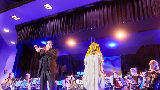 Zu Beginn standen die Akkordeonspieler im Saal verteilt und spielten jeweils einzeln eine Melodie aus sechs Tönen. Von Akkordeon zu Akkordeon weitergegeben, hallten die Klänge wie ein Berg-Echo durch den Saal. Unterstützt wurde die Atmosphäre durch Lichttechnik, so dass je nach Stimmung mal fröhlich bunte Lichter oder dramatisches Rot den Saal durchwanderten.