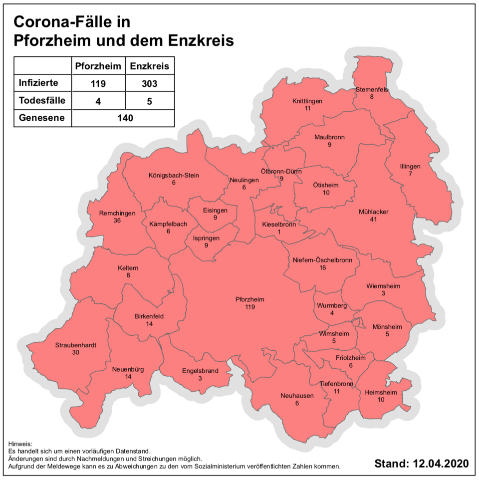 Demnach steigen die Fallzahlen in der Stadt Pforzheim von 106 auf nun 119. Im Enzkreis wurden laut neuester Zählung insgesamt 303 Personen positiv auf den Coronavirus getestet. Grund für den raschen Anstieg im Enzkreis sind vermutlich die Tests, die in einem Altenheim in Straubenhardt durchgeführt wurden – sowohl mehrere Bewohner als auch Pflegepersonal reagierten dabei positiv auf den Erreger.